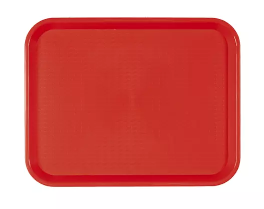 Grand plateau en polypropylène rouge 35,5 × 45,3 cm, lavable au lave‑vaisselle, antidérapant et recyclable – parfait pour cantines, food‑courts et fast‑food.