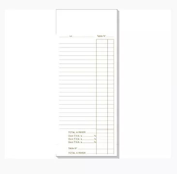 Chaque bloc contient 50 feuillets dupli numérotés de 1 à 50, garantissant une parfaite traçabilité des additions et un meilleur suivi administratif. Le format 98 x 235 mm offre un espace d’écriture confortable pour détailler les commandes tout en restant pratique et facile à manipuler.