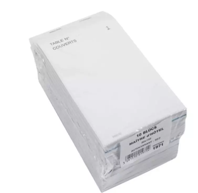 Description courte : Lot de 10 blocs de commandes autocopiants en duplicata, numérotés, idéal pour les professionnels de la restauration.