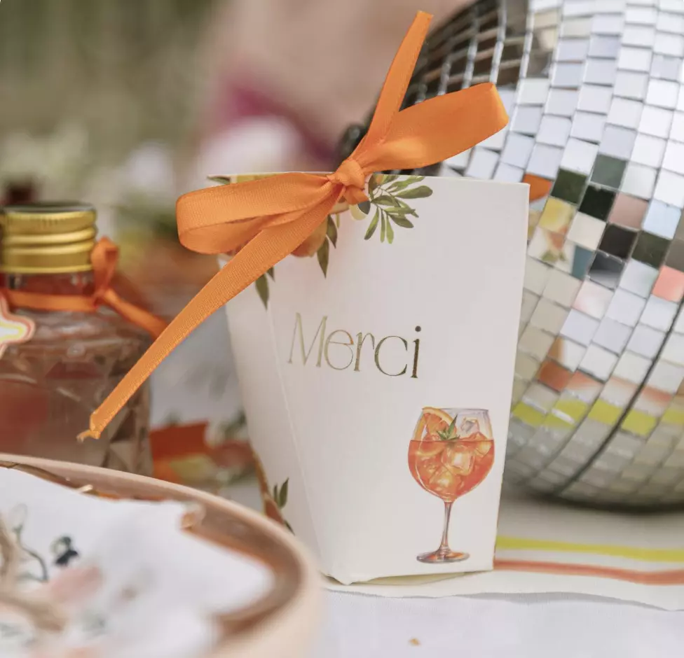 10 Contenants "Merci" Fizz Agrume Papier Crème, Orange et Or 8x9x4cm et Ruban Satin Orange