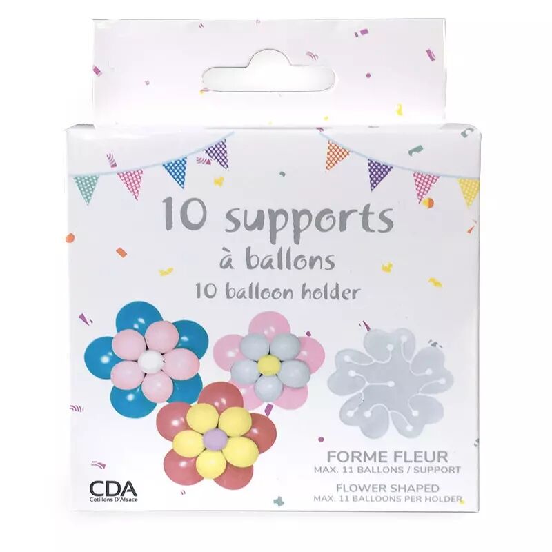 Lot de 10 supports en plastique rigide, chaque support à ballon mesurant environ 8 cm de diamètre et conçu en forme de fleur, permettant de fixer des ballons latex ou aluminium et de composer des décorations florales aériennes.
