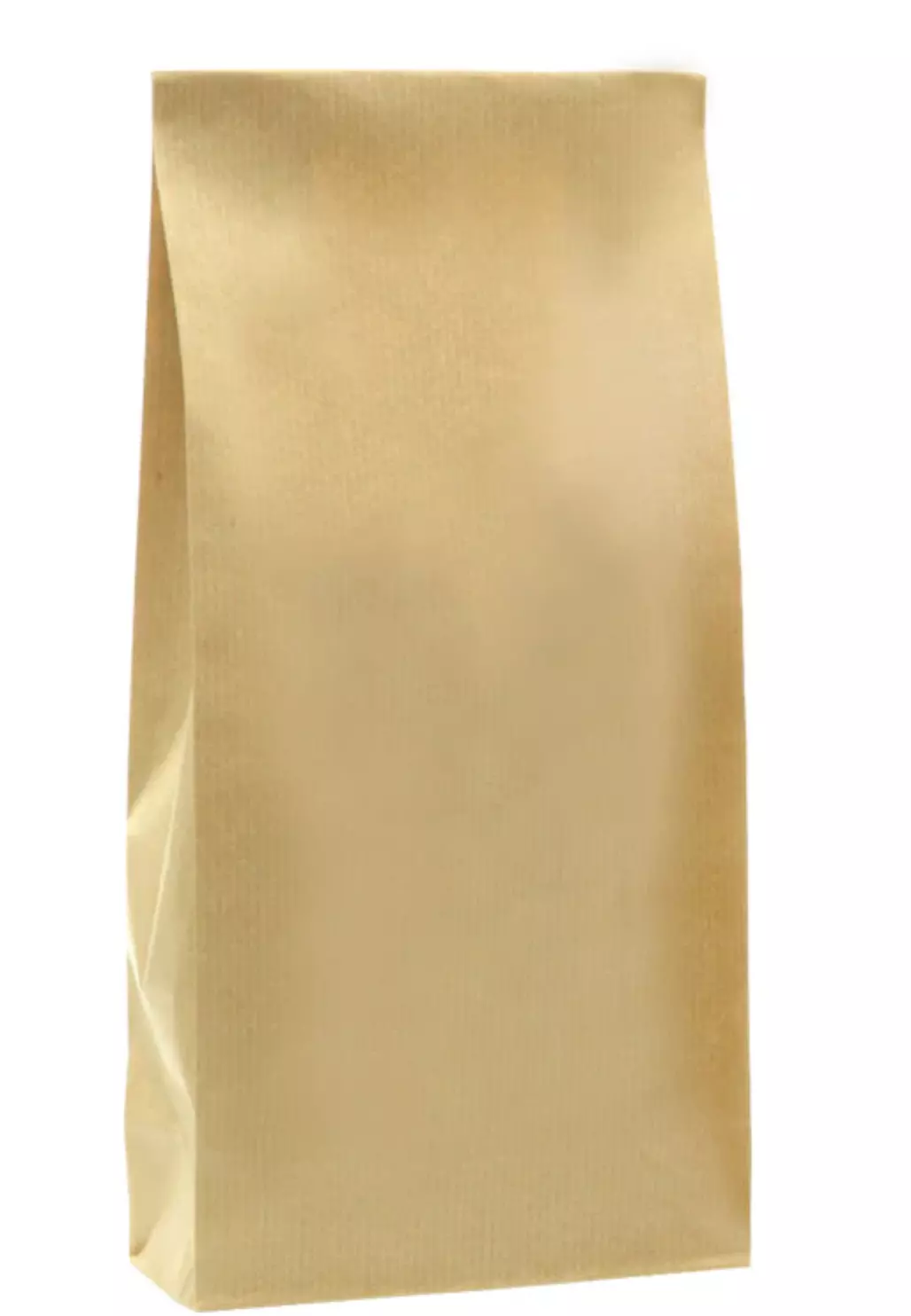Lot de 100 sacs fond SOS en kraft brun vergé 90 g/m², couverture avant en film polypropylène, dimensions 13.5+7.5×31.5 cm, contenance 850 ml. Idéal pour produits secs en vente en vrac.