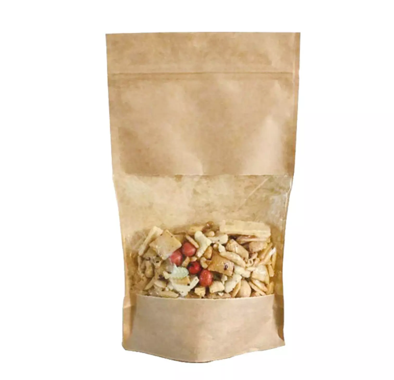 Paquet de 100 sachets de type stand-up (Doypack), en papier kraft brun 40 g/m² doublé d’un film polypropylène 40 µ, fenêtre transparente et fermeture zip hermétique, dimensions 11 + 6,5 × 18,5 cm.