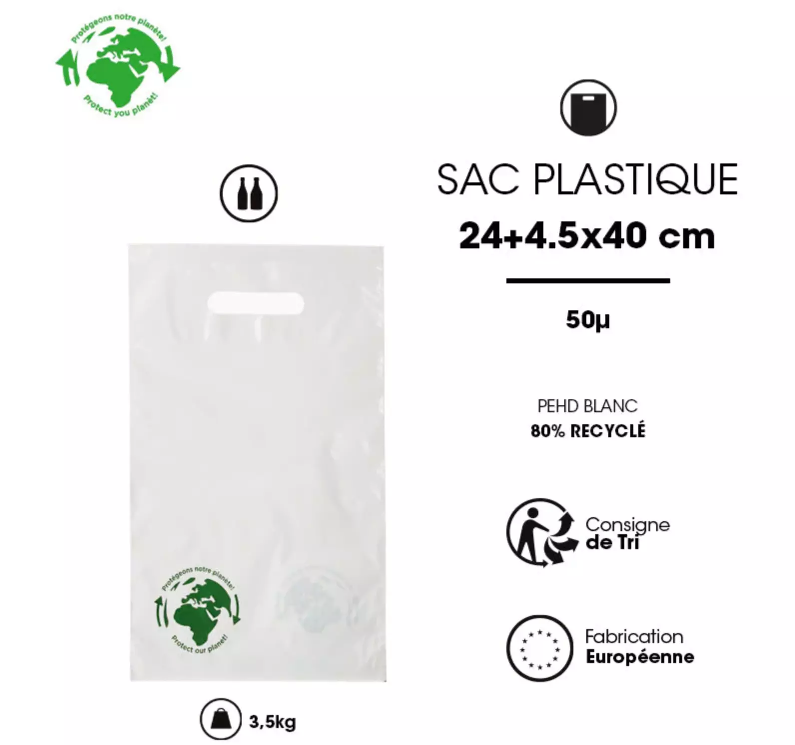 Paquet de 100 sacs en PEBD blanc recyclé, spécialement conçus pour transporter deux bouteilles, avec poignées découpées. Dimensions : 24 × 40 cm + 4,5 cm de soufflet, épaisseur du plastique 50 µm.