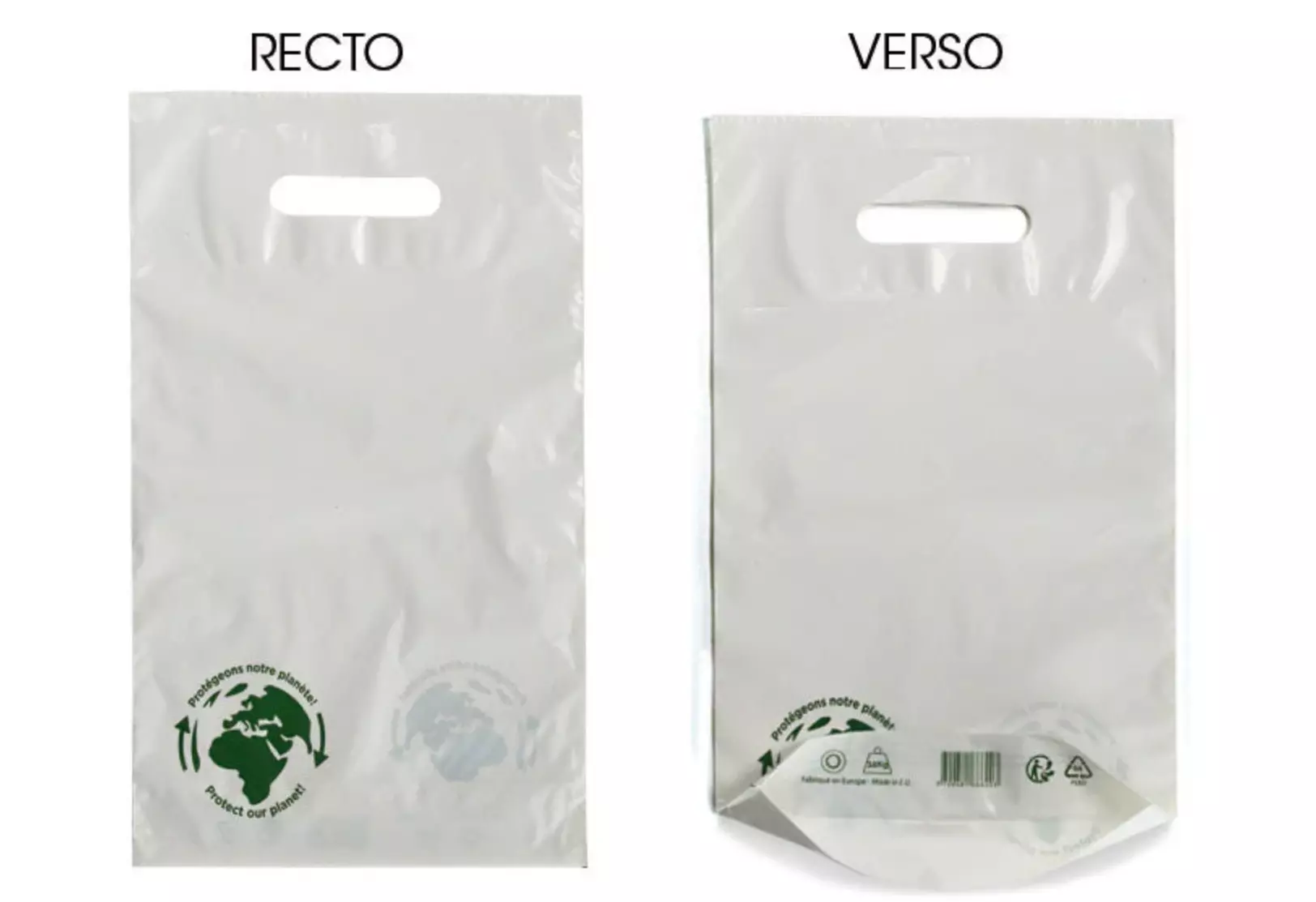 La référence **11342** désigne un sac réutilisable fabriqué à 100 % à partir de matériaux recyclés issus du circuit de recyclage des déchets plastiques européens. En polyéthylène basse densité (PEBD) blanc, ce sac est conforme à la loi n° 2015-992 du 17 août 2015 et est conditionné en paquet de 100 unités pour un usage professionnel optimisé.