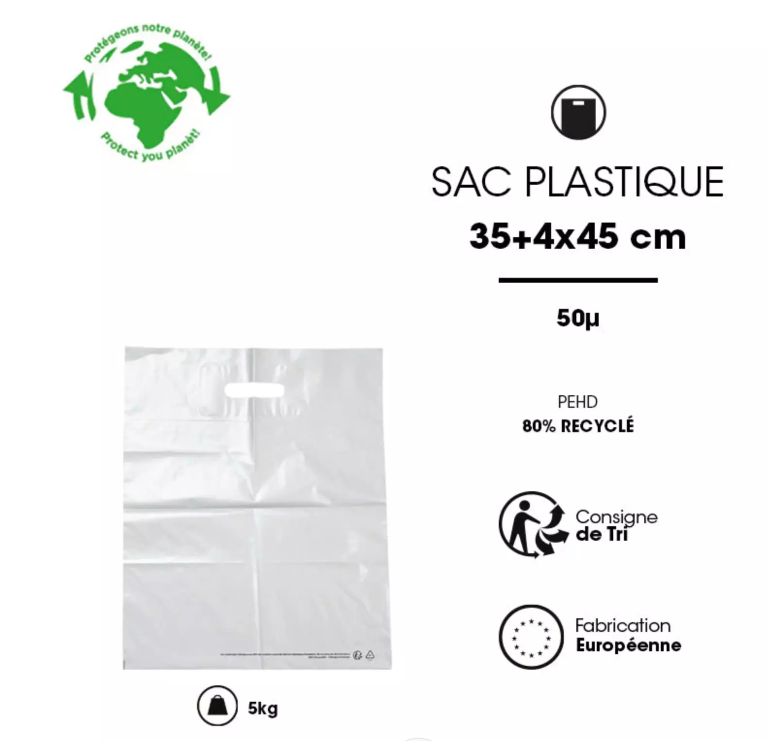 Paquet de 100 sacs plastique blancs, en PEBD recyclé, avec poignées découpées, épaisseur 50 µm, aux dimensions 35 × 45 + 4 cm