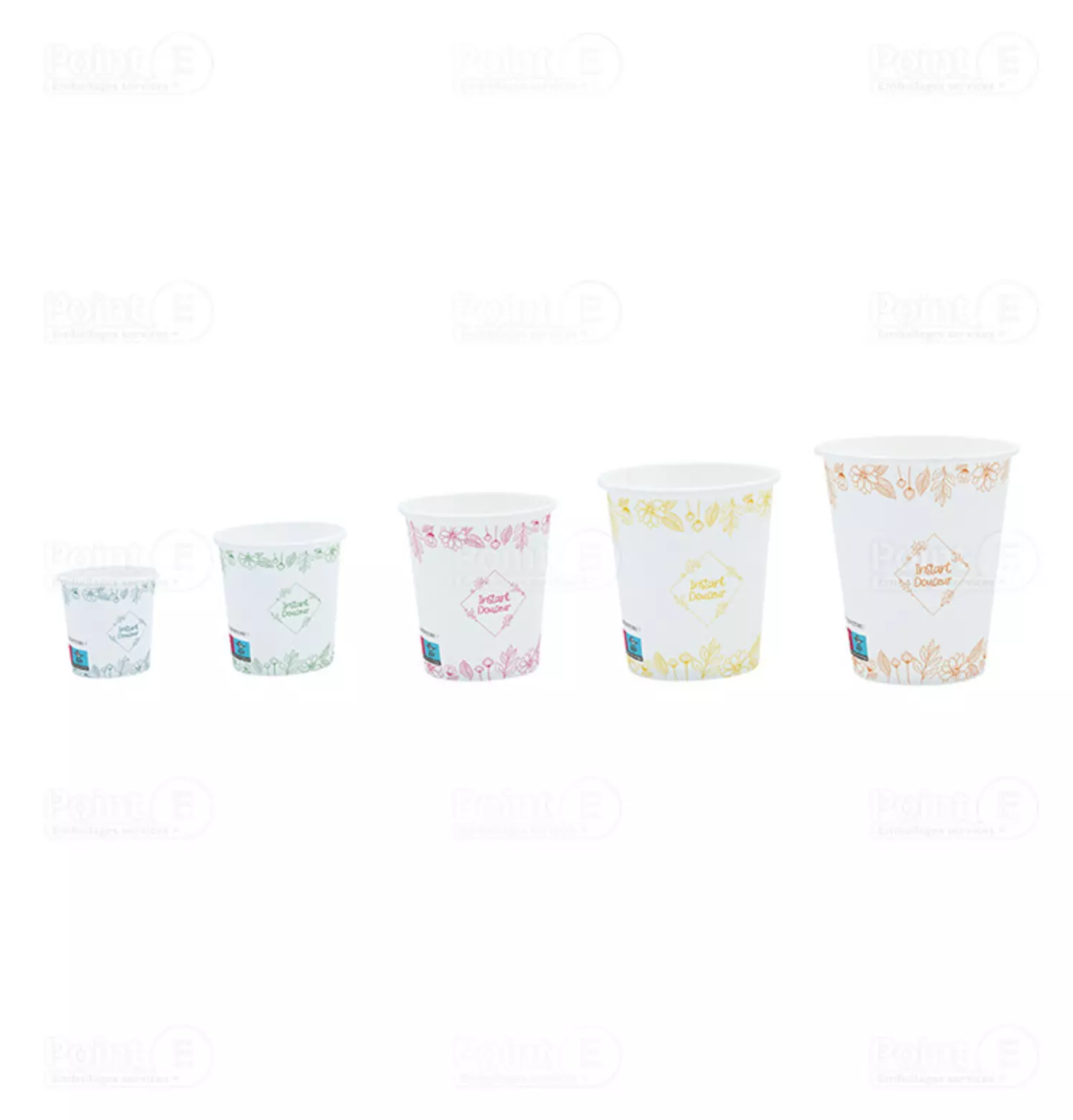 Glisser un gobelet dans un sachet, distribuer à vos clients. Gobelets adaptés aux boissons chaudes ou froides, usage unique recommandé. Recycler via la filière carton adaptée pour les emballages laminés.