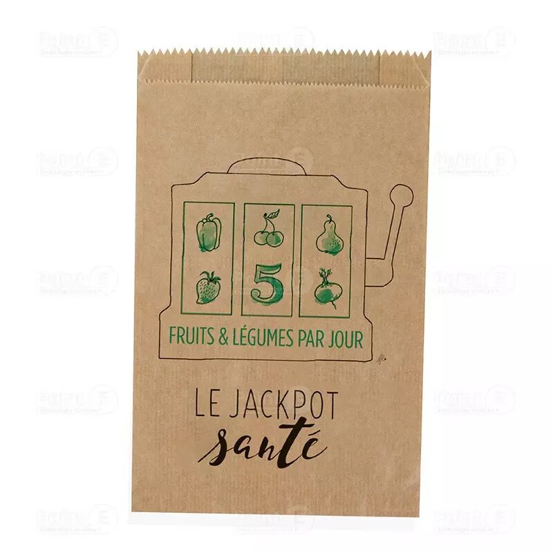 La référence **KRIN155PTE** désigne un sac "Jackpot Santé" exclusif pour fruits et légumes. Fabriqué en papier kraft vergé de 36 g/m², il est robuste, léger et respirant. Le coloris brun, associé à des motifs verts, valorise la présentation et rappelle l’importance d’une alimentation équilibrée. Conditionné en carton de **1 000 unités**.
