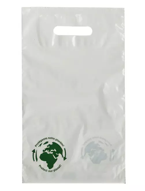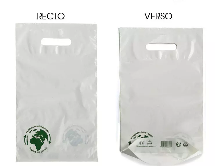 Pack de 1 000 sacs plastiques réutilisables en PEBD blanc recyclé avec poignées découpées, dimensions 24 × 40 + 4,5 cm, épaisseur 50 µm