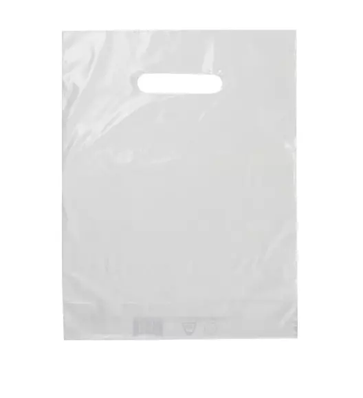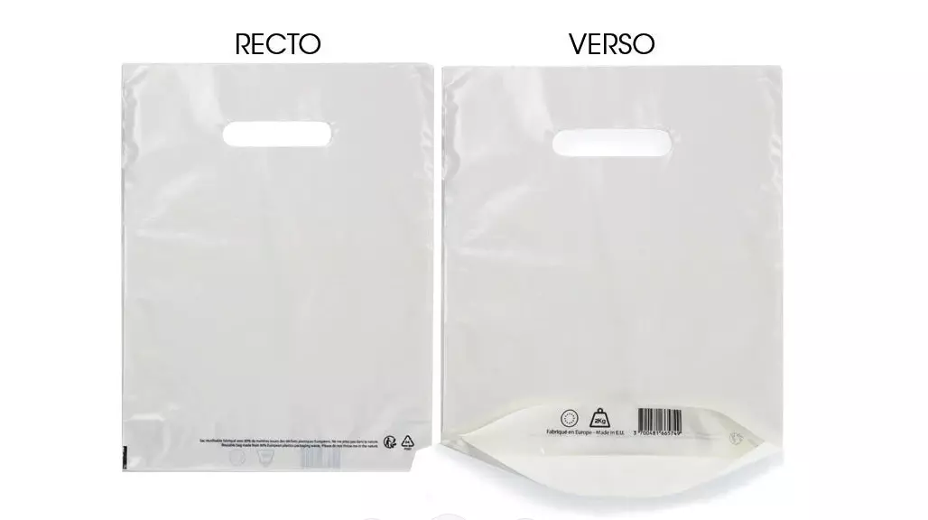 Carton de 1 000 sacs plastique blanc à poignées découpées, fabriqués en PEBD 100 % recyclé, dimensions 25 × 32 cm avec soufflet de 4 cm, épaisseur 50 µ.