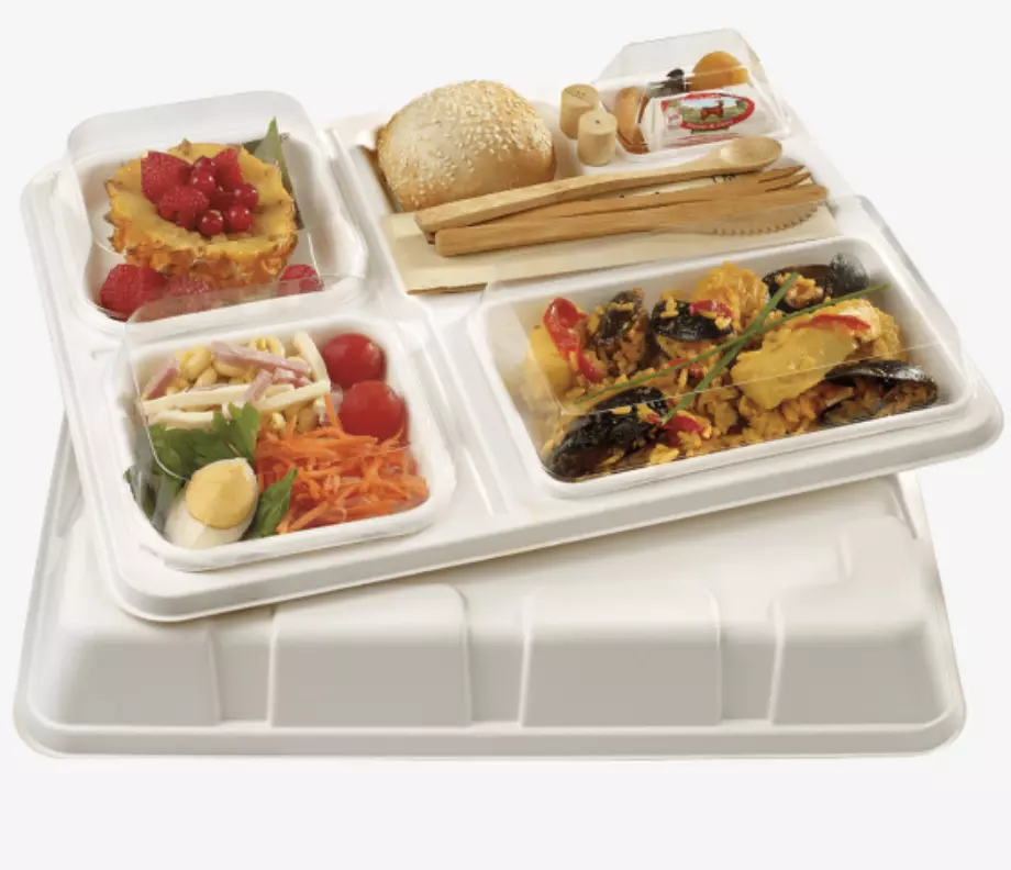 Ce couvercle clipsable en pulpe de canne est conçu pour refermer efficacement le Plateau Natura à 5 compartiments tout en préservant la chaleur et la présentation des aliments. Résistant et élégant, il s’intègre parfaitement à une offre repas jetable haut de gamme et compostable.