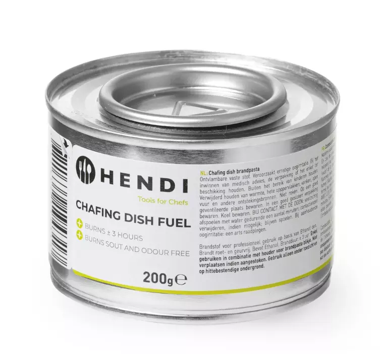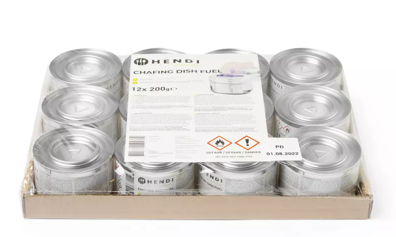 La référence **194362** correspond à une pâte combustible solide ou gélifiée, spécialement conçue pour alimenter en chaleur les chafing dishes et réchauds de buffet. Formulée à base d’alcool éthanol naturel, d’eau et d’un agent épaississant, elle est également conçue avec un goût très amer pour empêcher toute ingestion accidentelle. Conditionnée en carton de **12 boîtes de 200 g**, chaque unité brûle pendant **environ 3 heures**