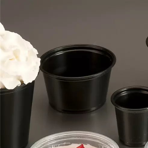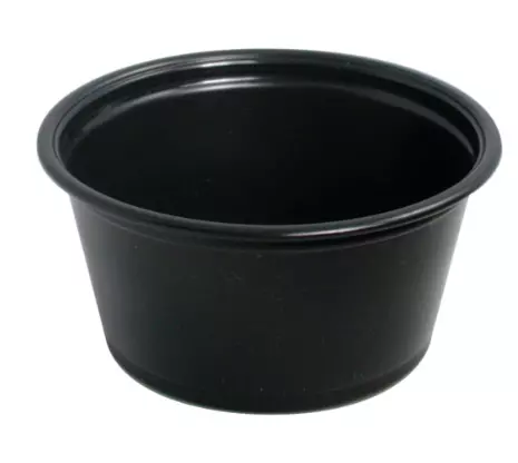 Pot noir en polypropylène (PP), capacité 60 ml, micro‑ondable et recyclable, vendu en carton de 125 unités. Idéal pour sauces, condiments et portions à emporter avec présentation chic.