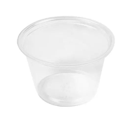 Petit pot transparent en polypropylène (PP), capacité 120 ml, micro‑ondable et recyclable, vendu en carton de 125 unités. Idéal pour sauces, dips ou compléments à emporter.