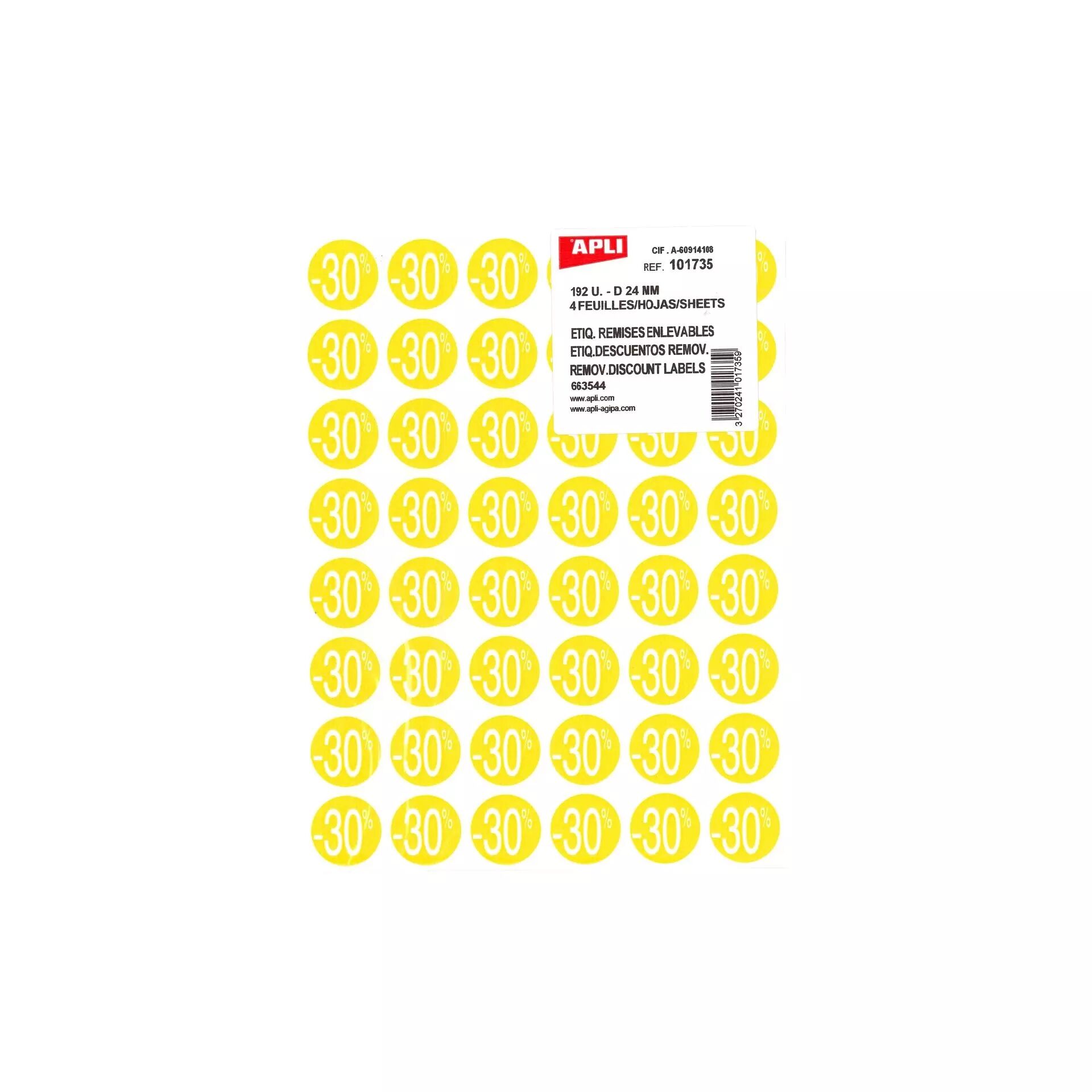 Pochette de 190 pastilles jaunes Ø 24 mm impression - 30 %. Étiquettes prêtes à l'emploi pour les soldes.