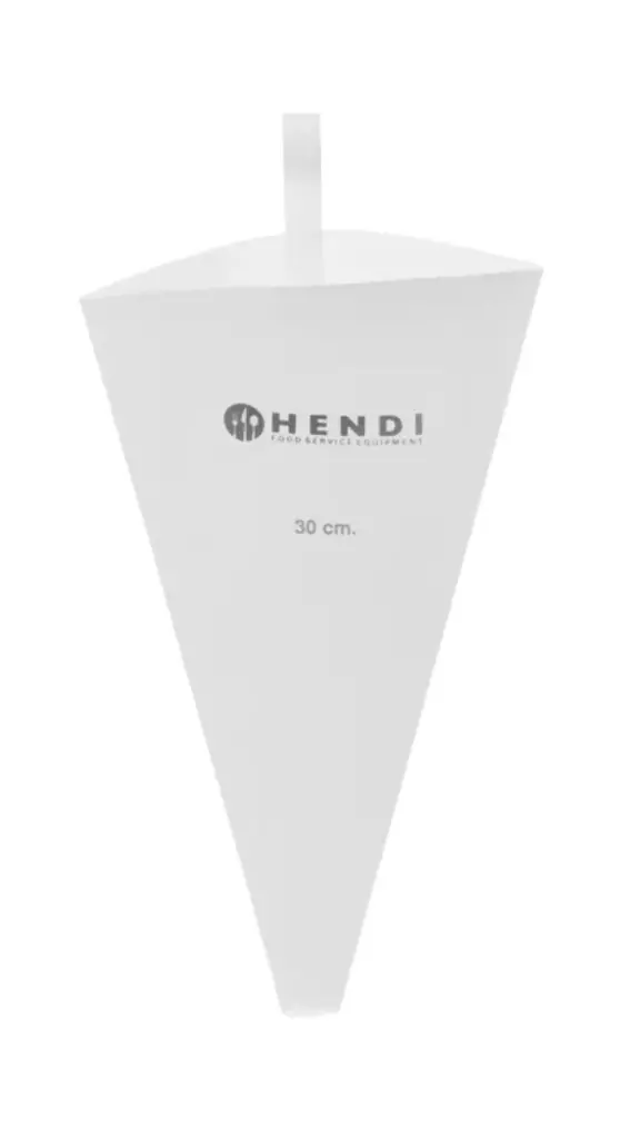 La référence **550120** désigne un kit de deux poches pâtissières en coton de la gamme Kitchen Line de HENDI. Elles combinent une structure textile souple et un revêtement intérieur en polyuréthane qui empêche l’adhérence des préparations, facilitant le nettoyage. L’anneau intégré permet de les accrocher et elles supportent un nettoyage à haute température (eau bouillante), gage de durabilité professionnelle.