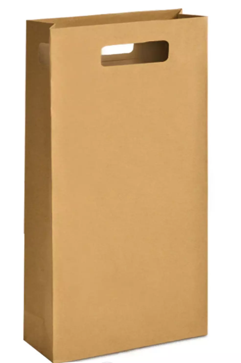 La référence **23025** désigne une élégante pochette kraft conçue pour transporter deux bouteilles. Fabriquée en papier kraft naturel épais (175 g/m²), elle offre robustesse et maintien. Son design *ultra-plat* permet un rangement aisé, tandis que les **poignées découpées** assurent une prise en main confortable. Conditionnée par 100 unités, filmées par lots de 10.