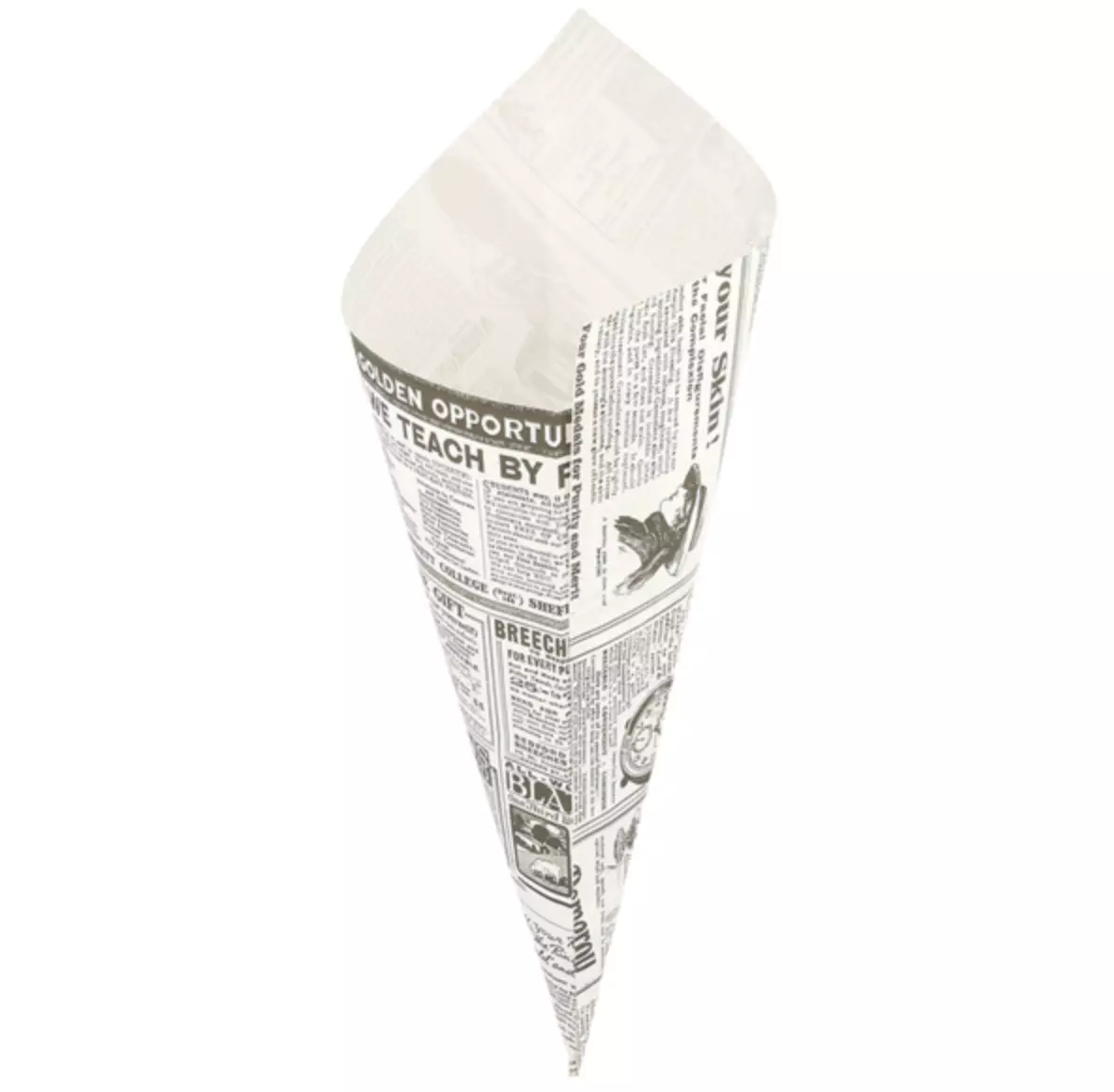 La référence **167.43PF** propose des cônes en papier anti-graisse **sans PFAS**, au format 29,5 × 21 cm. Parfaits pour street-food, frites ou snacks. Boîte de 2 000 unités.