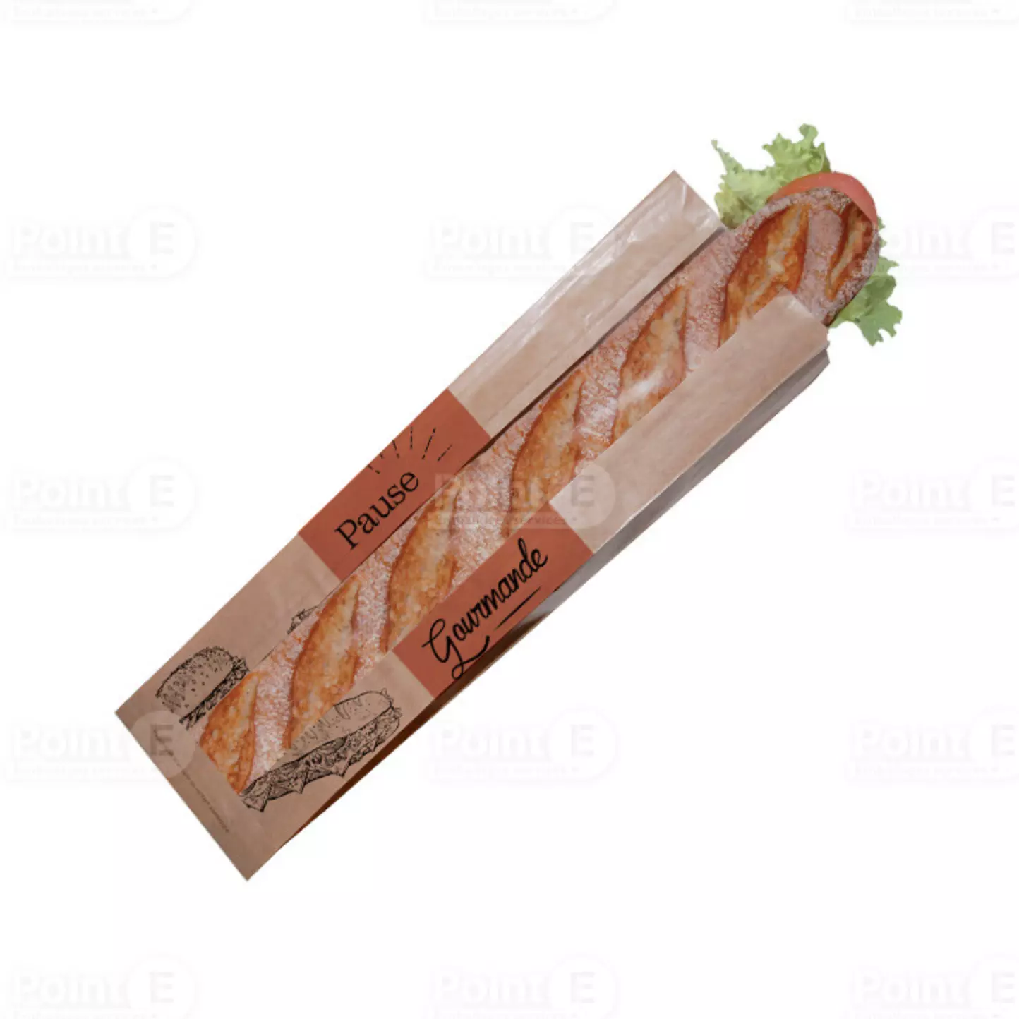 La référence **PAINKBF1034**, nommée *Pause Gourmande*, est un sac sandwich avec une fenêtre en PP pour valoriser le contenu. Fabriqué en papier kraft brun ingraissable 35 g/m², il garantit solidité et fonctionnalité. Conditionné par **1 000 unités**.