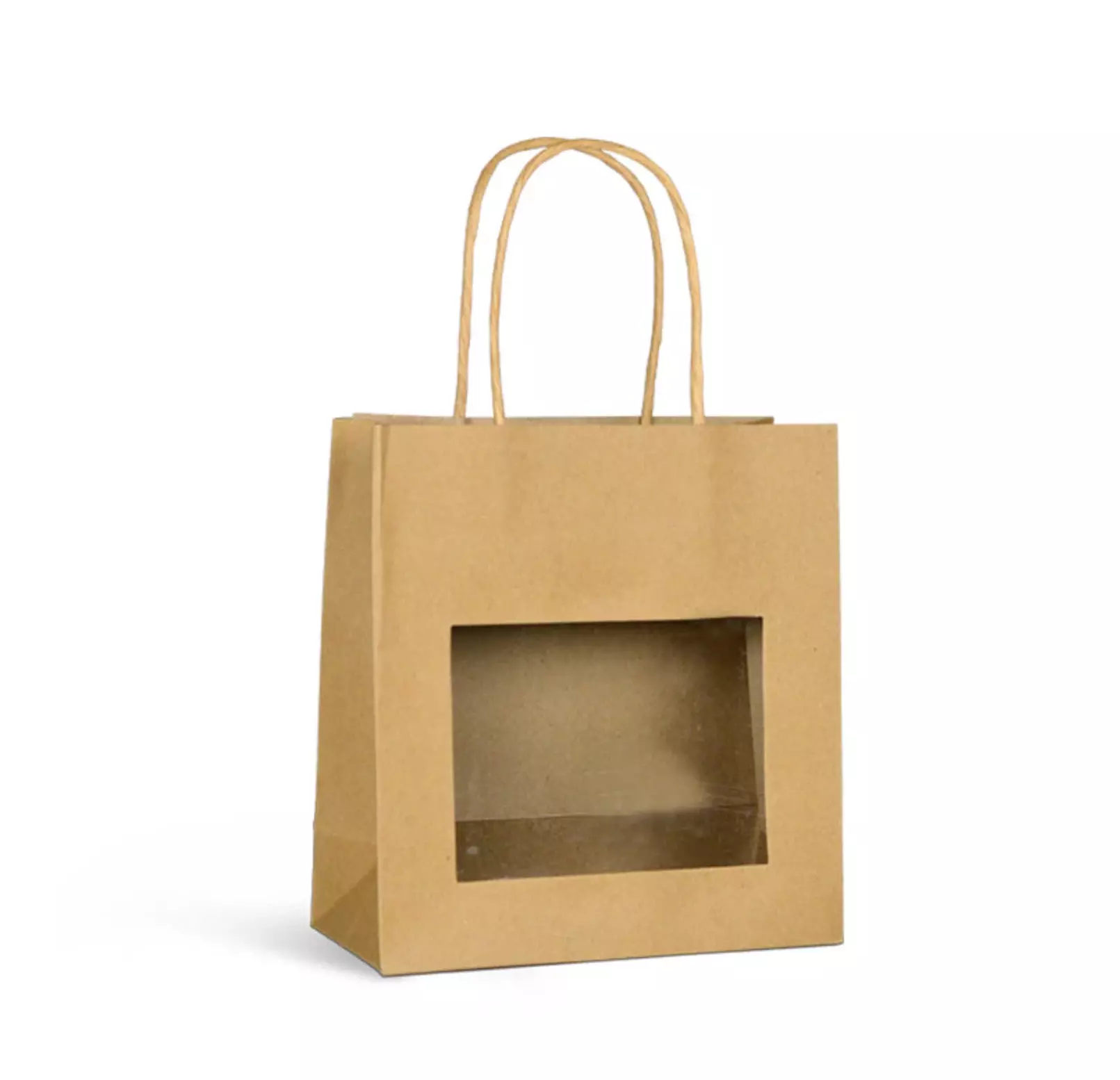 Carton de 240 sacs vitrine en papier kraft brun 180 g/m², doté de poignées papier torsadées et d’une vitrine transparente en PET, format 18+8 × 19 cm