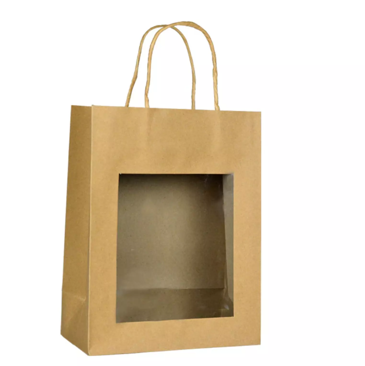 Carton de 240 sacs kraft brun épais 180 g/m², équipés d’une fenêtre vitrine en PET et de poignées torsadées.