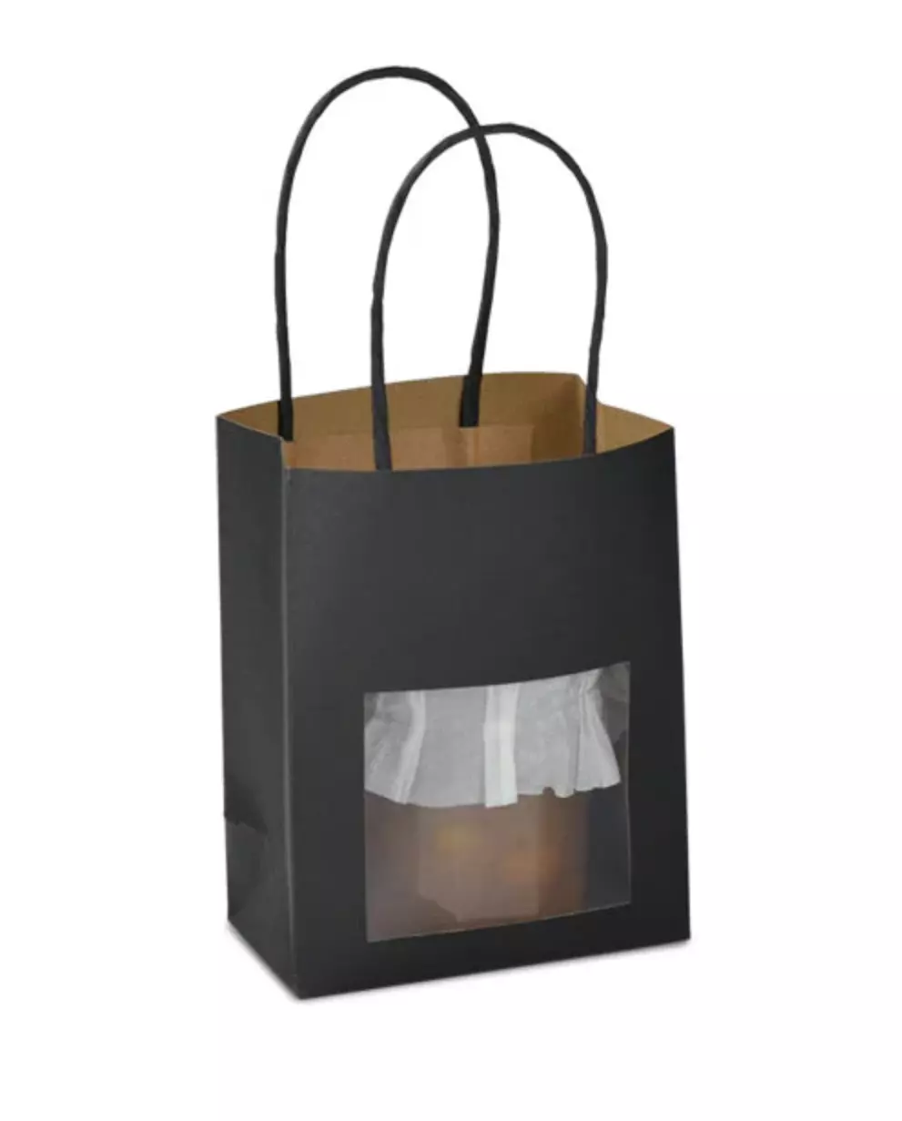 Paquet de 25 sacs vitrine en kraft brun avec impression noire, épaisseur 180 g/m², poignée torsadée en papier, fenêtre PET, dimension 11,4+6,4 × 14,6 cm.