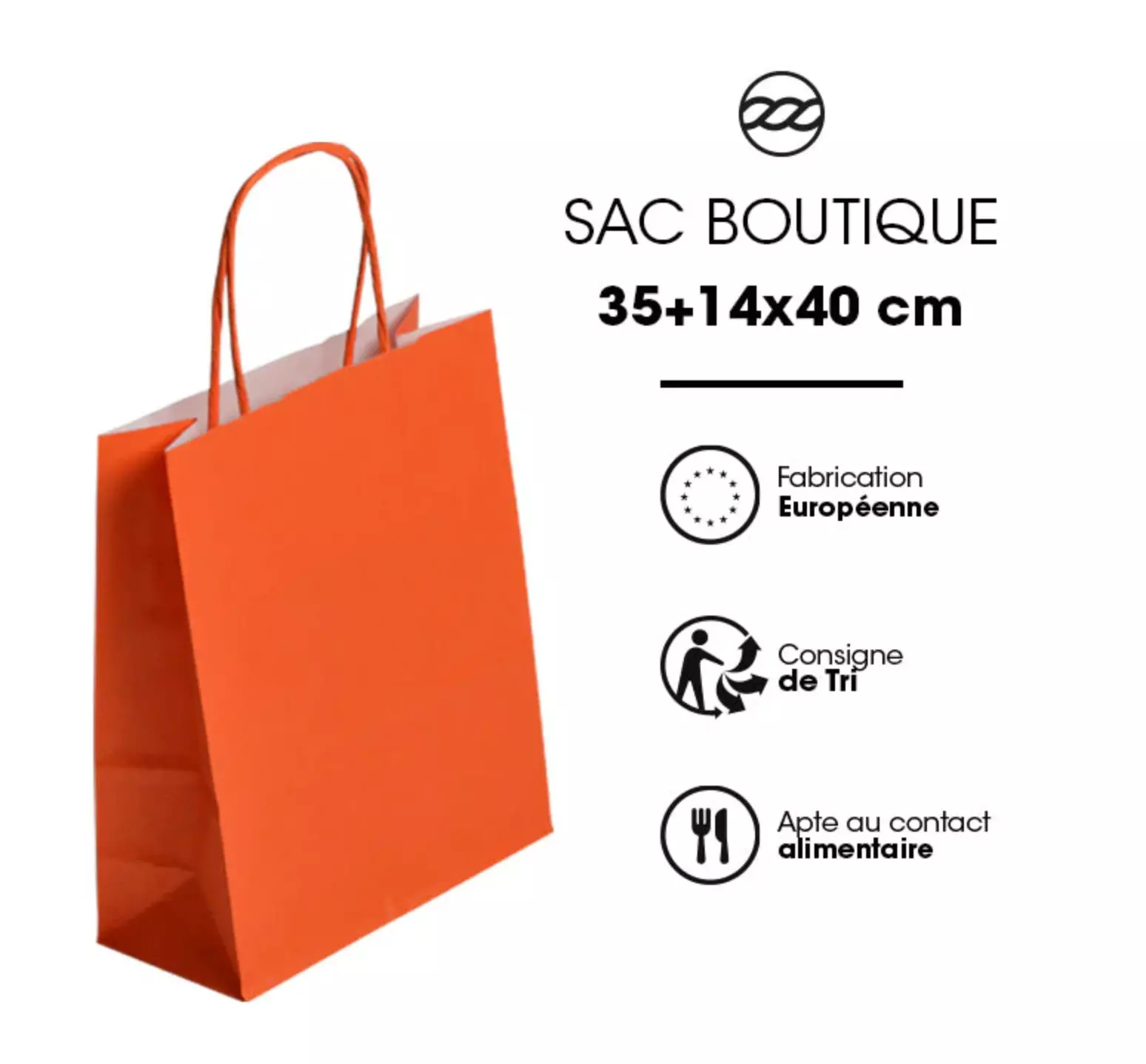 Lot de 250 sacs boutique au design coloré (ORANGE), fabriqués en papier kraft blanc lisse de 100 g/m², avec poignées torsadées, 100 % recyclables.
