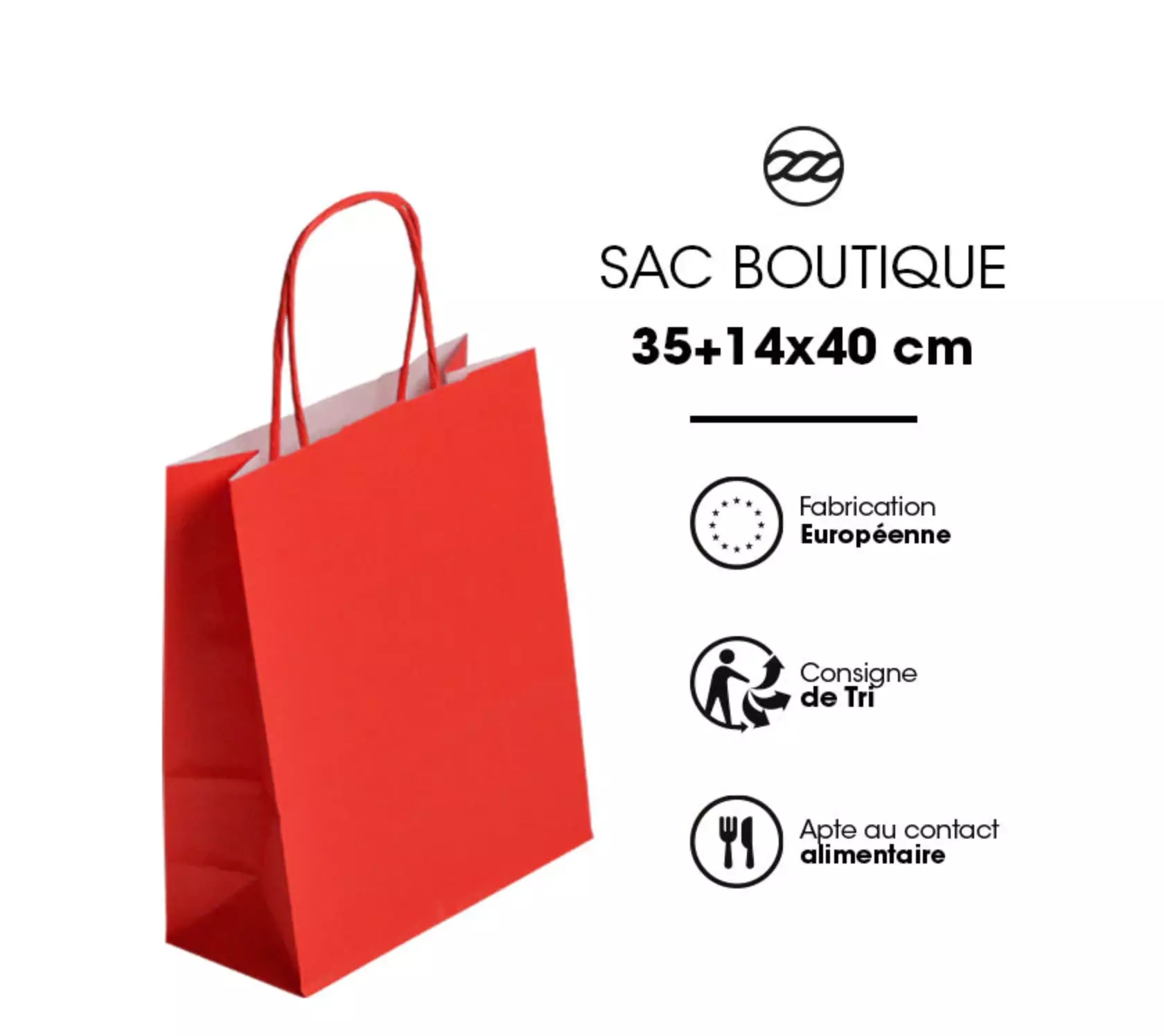 Le **sac Festival Rouge (Réf. 21281)** est un sac boutique haut de gamme, réalisé en papier kraft blanc lisse de 100 g/m², reconnu pour sa solidité et sa présentation élégante. Ses poignées torsadées offrent un confort de transport optimal. Conditionné en lot de 250 unités (5 paquets de 50).