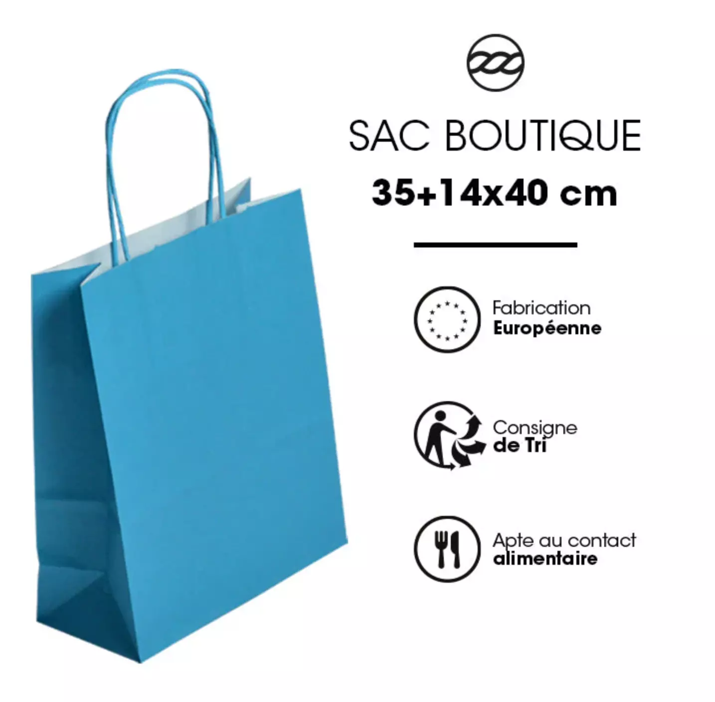 Lot de 250 sacs boutique coloris turquoise, fabriqués en kraft blanc lisse 100 g/m², dimensions 35+14 × 40 cm, entièrement recyclables, conditionnés par paquets de 50 sous film