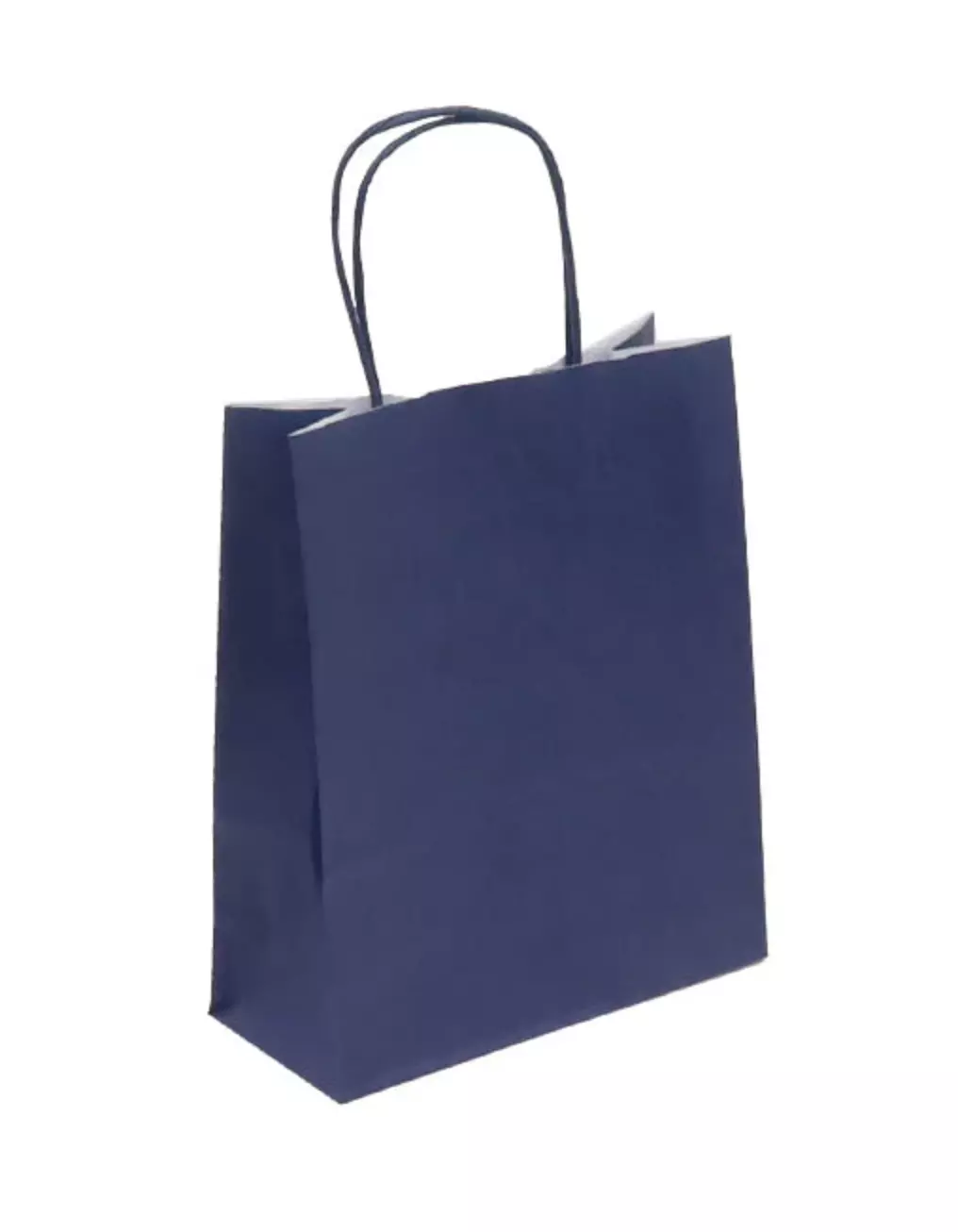 Sac boutique bleu navy avec kraft blanc 90 g/m², poignées torsadées, dimensions 23+12×30 cm, vendu par lot de 250 unités