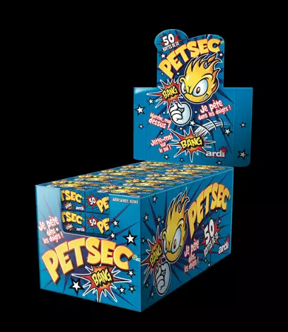 Présentoir extérieur PETSEC® composé de 50 boîtes × 50 pièces, avec effets sonores, hauteur 1,0 m, poids de 0,3 g par pièce. Dimensions du colis : 25,0 × 36,0 × 23,0 cm.