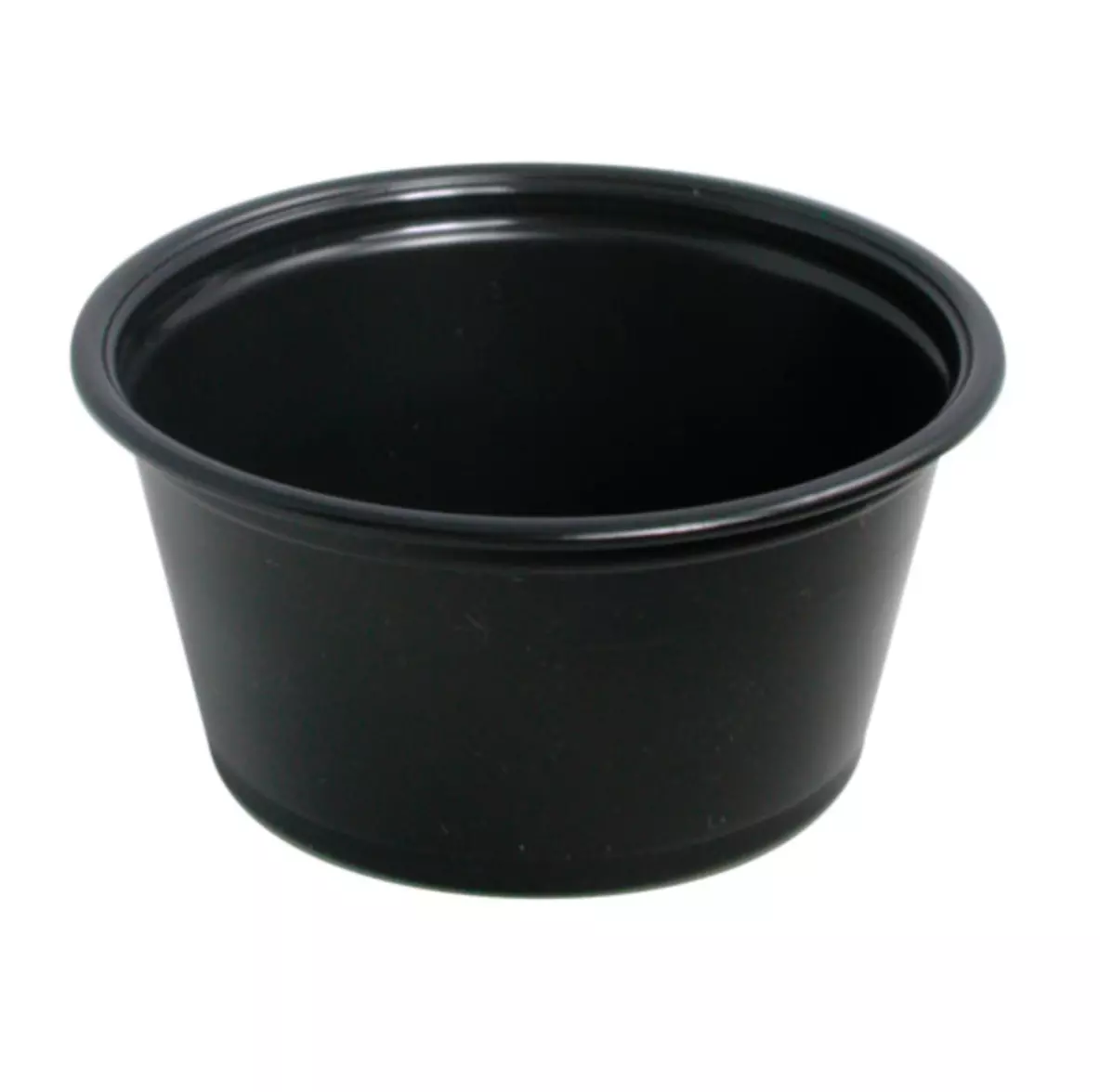 Pot noir en polypropylène (PP), capacité 60 ml, micro‑ondable et recyclable, vendu en carton de 2 500 unités. Idéal pour sauces, condiments et portions à emporter avec présentation chic.