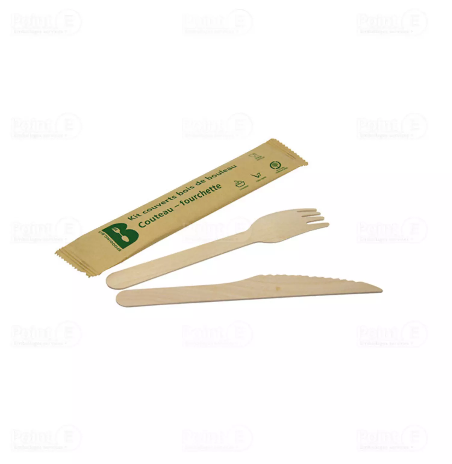 Lot de 250 kits composés d’une fourchette, d’un couteau et d’une serviette en bois de bouleau beige, conditionnés en 5 sachets de 50.