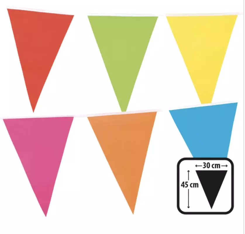 Enrichissez votre offre avec cette élégante guirlande multicolore de 10 mètres, composée de 18 grands fanions triangulaires en plastique. Avec des dimensions de 45 x 30 cm par fanion, elle se démarque par son format imposant et sa durabilité, idéale pour les événements festifs.
