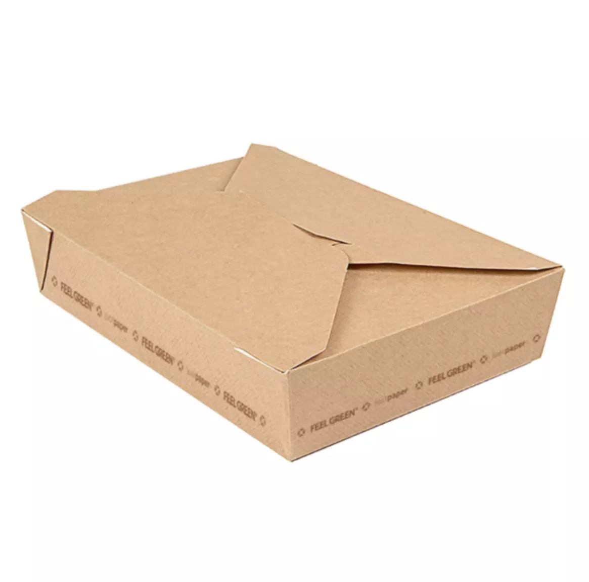 Carton de 300 boîtes à emporter micro‑ondables en carton ondulé nano‑micro naturel, capacité 1 470 ml, dimensions 19,6 × 14 × 4,5 cm, grammage 220 g/m².