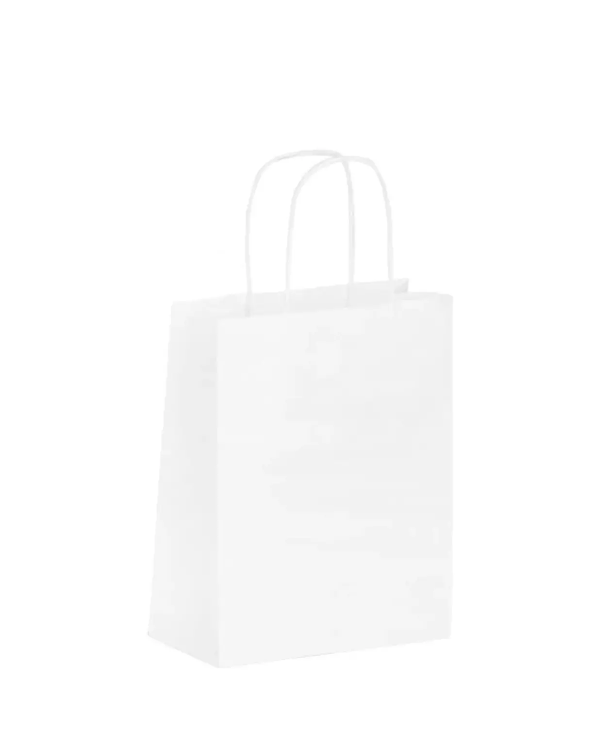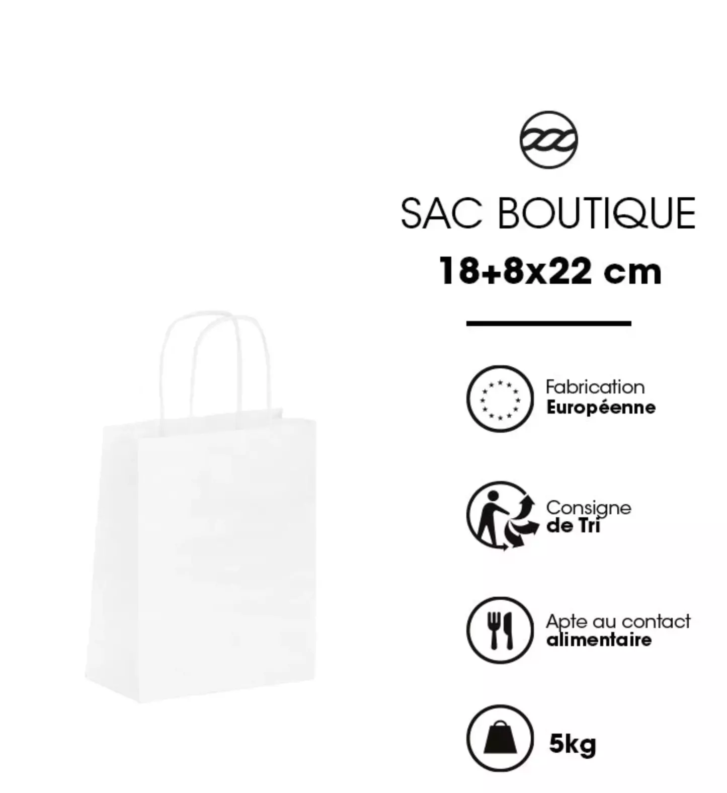 Lot de 300 sacs boutique en papier kraft blanc 90 g/m², façonnés avec poignées torsadées. Format 18+8 × 22 cm, robustes (jusqu’à 5 kg), conditionnés par paquets de 50 sous film.