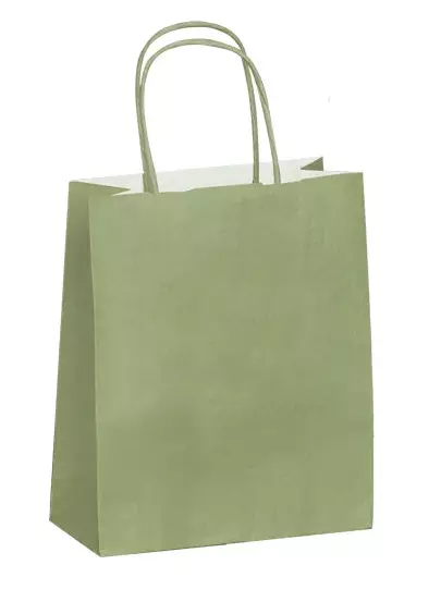 Carton de 300 sacs boutique couleur vert amande en papier kraft blanc de 90 g/m², doté de poignées torsadées, dimensions 18+8 × 22 cm