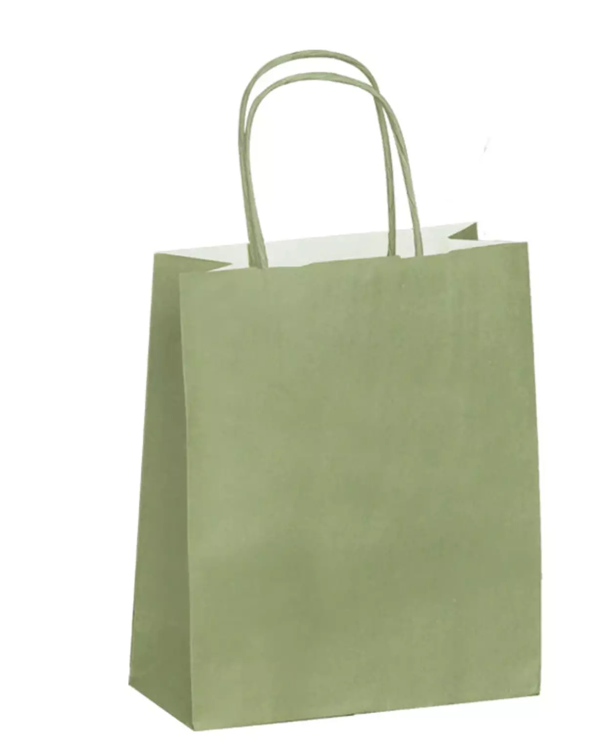 Lot de 300 sacs boutique en papier kraft blanc lisse 90 g/m², couleur vert amande, avec poignées torsadées, dimensions 23+12 × 30 cm, réutilisables.
