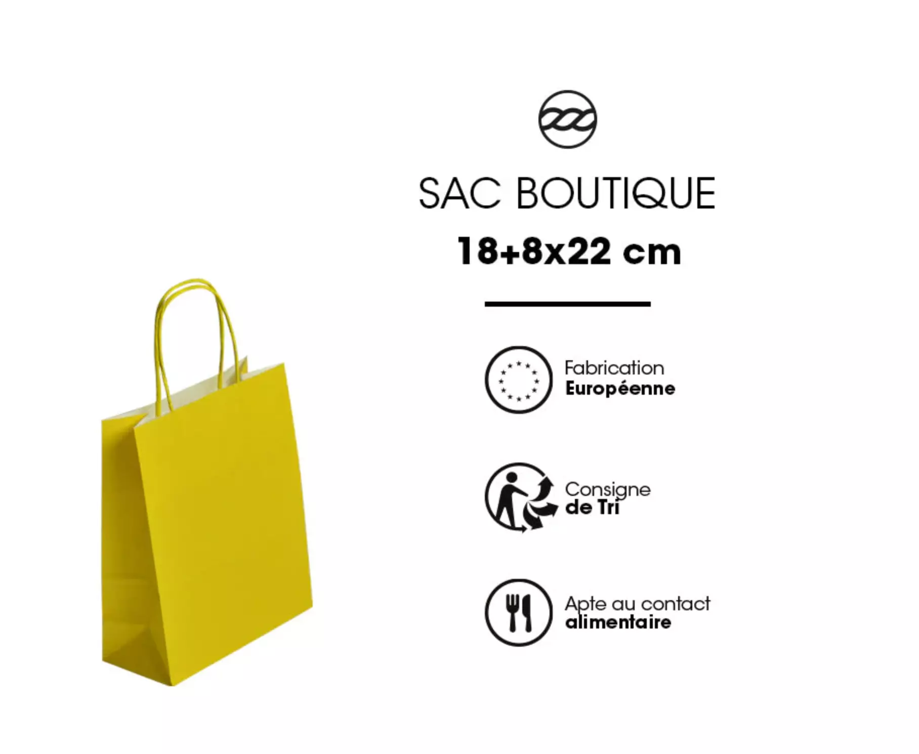 Carton de 300 sacs boutique en papier kraft blanc lisse de 90 g/m², munis de poignées torsadées, dimensions 18+8 × 22 cm.