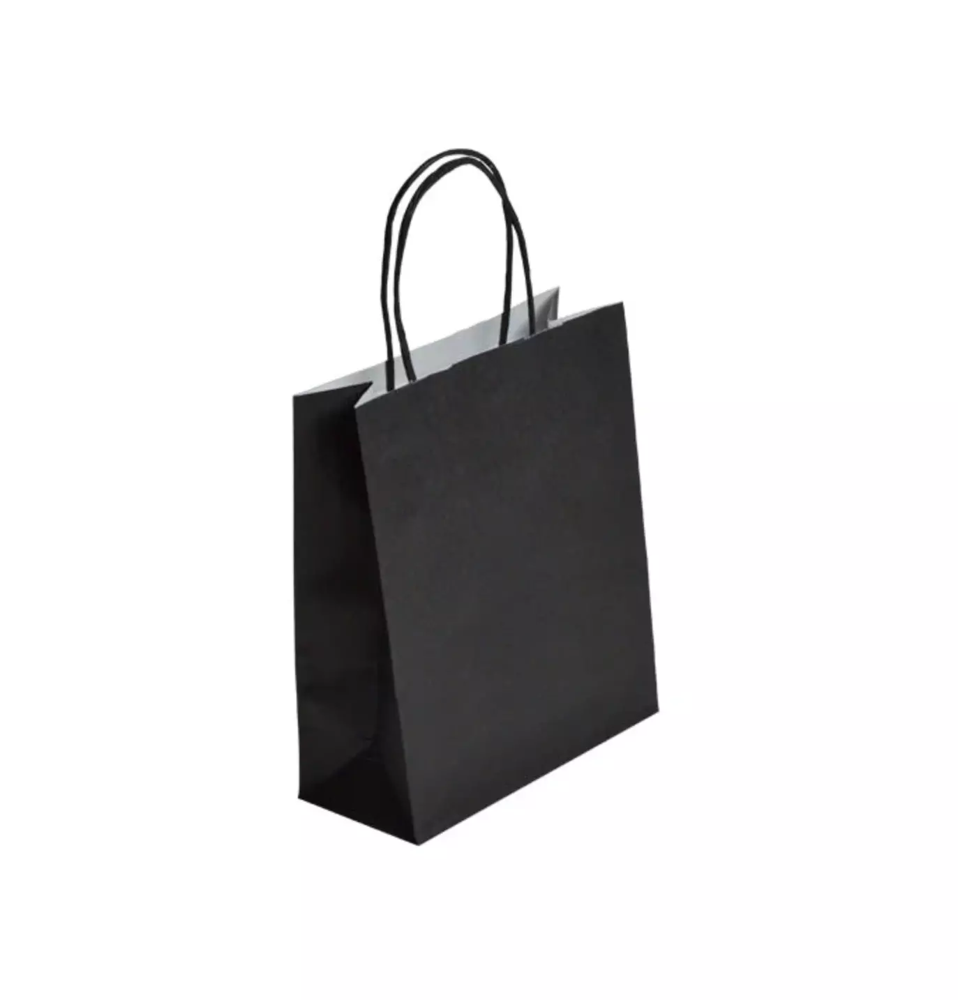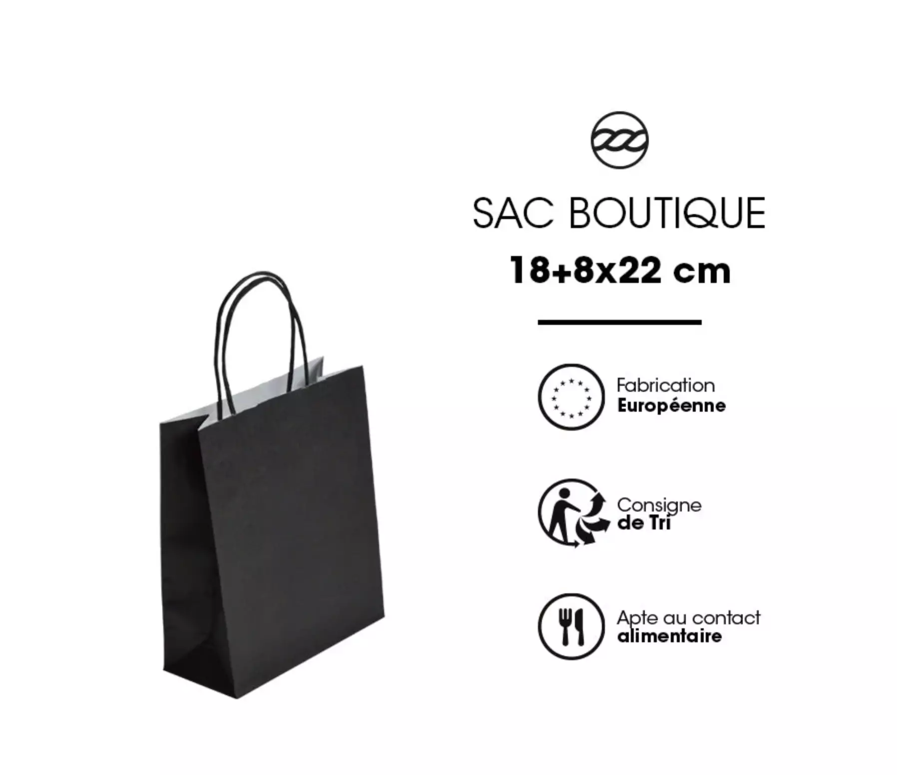 Carton de 300 sacs boutique noirs, format 18+8×22 cm, en papier kraft blanc de 90 g/m² avec poignées torsadées. 100 % recyclable. Conditionnés par 50 sous film protecteur.