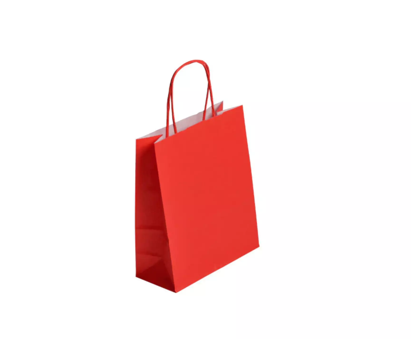 Le sac **“FESTIVAL Rouge”** est conçu pour répondre aux besoins de présentation et de portage dans les boutiques de détail. Fabriqué en papier kraft blanc lisse de 90 g/m² et teinté en rouge, il dispose de poignées torsadées robustes pour une tenue renforcée. Conditionné en carton de **300 pièces**