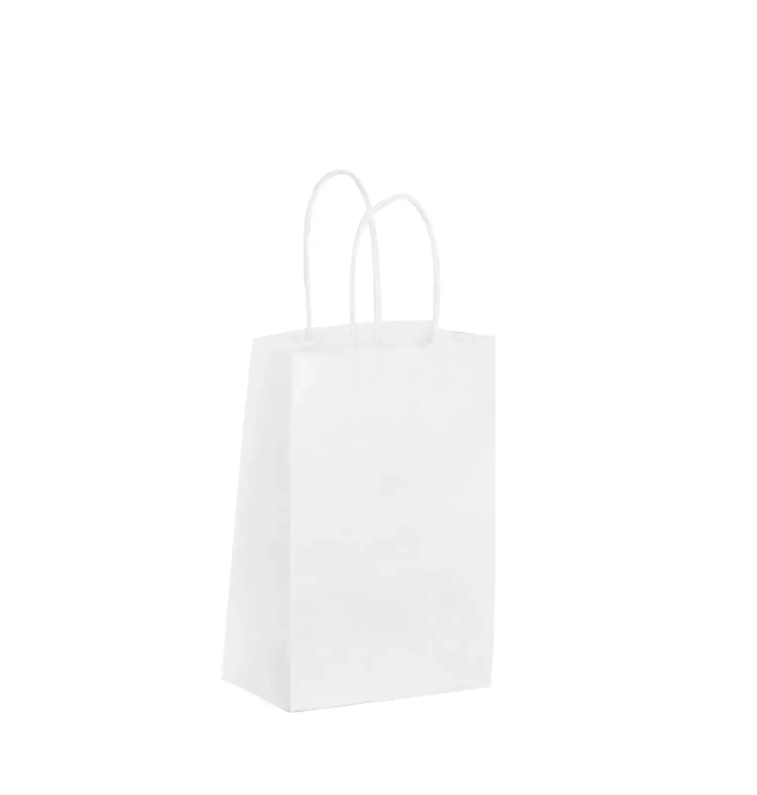 Sac boutique en papier kraft blanc 90 g/m² lisse, avec poignées torsadées. Format 14+8 × 21 cm, résistant jusqu’à 3 kg, conditionné par 400 unités dans un carton.
