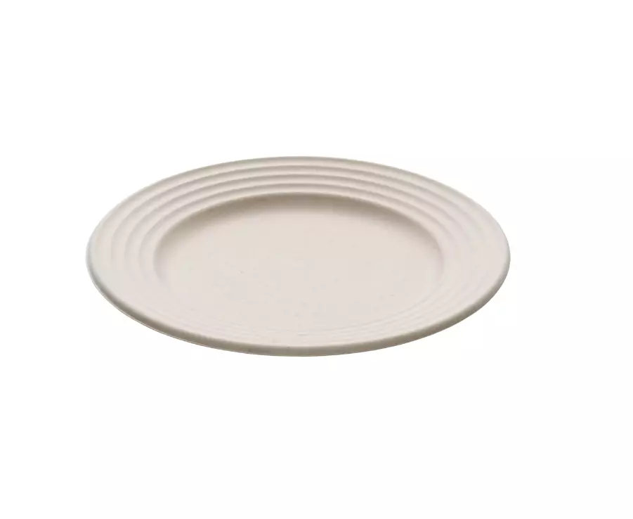Pack de 50 assiettes WAVE en fibre de canne naturelles, diamètre 23 cm, compostables, utilisables au micro-ondes — idéal pour un service pratique et écologique.