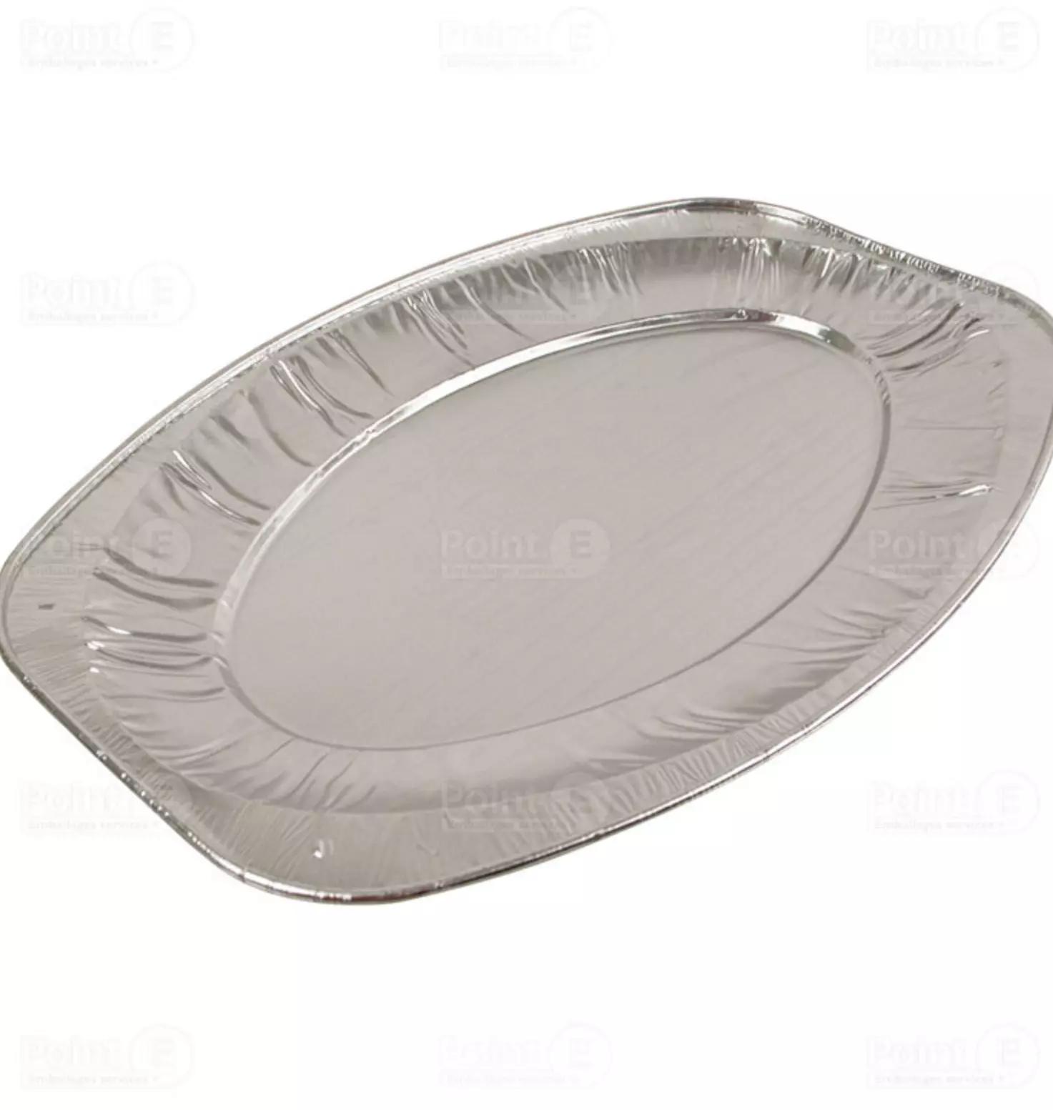 Plat ovale en aluminium gris, dimensions 550 × 360 × 22 mm, capacité 2 600 ml. Conditionné en lot de 50 pièce.