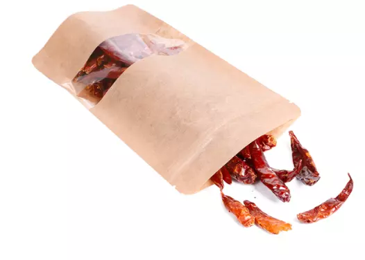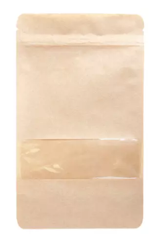Carton de 50 sacs autocollants en kraft naturel 45 + 13 PET + 27 CPP, dimensions 13 × 22,5 cm, grammage total 250 g/m².