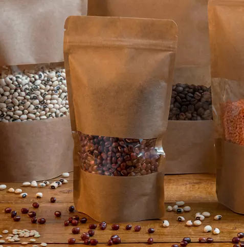 La référence **258.03** est un sac avec fermeture autocollante, conçu pour conditionner aliments secs ou semi-humides. Fabriqué en kraft naturel renforcé de PET et CPP, avec un grammage élevé de 250 g/m², il assure une excellente résistance. Conditionné en boîte de 50 unités.