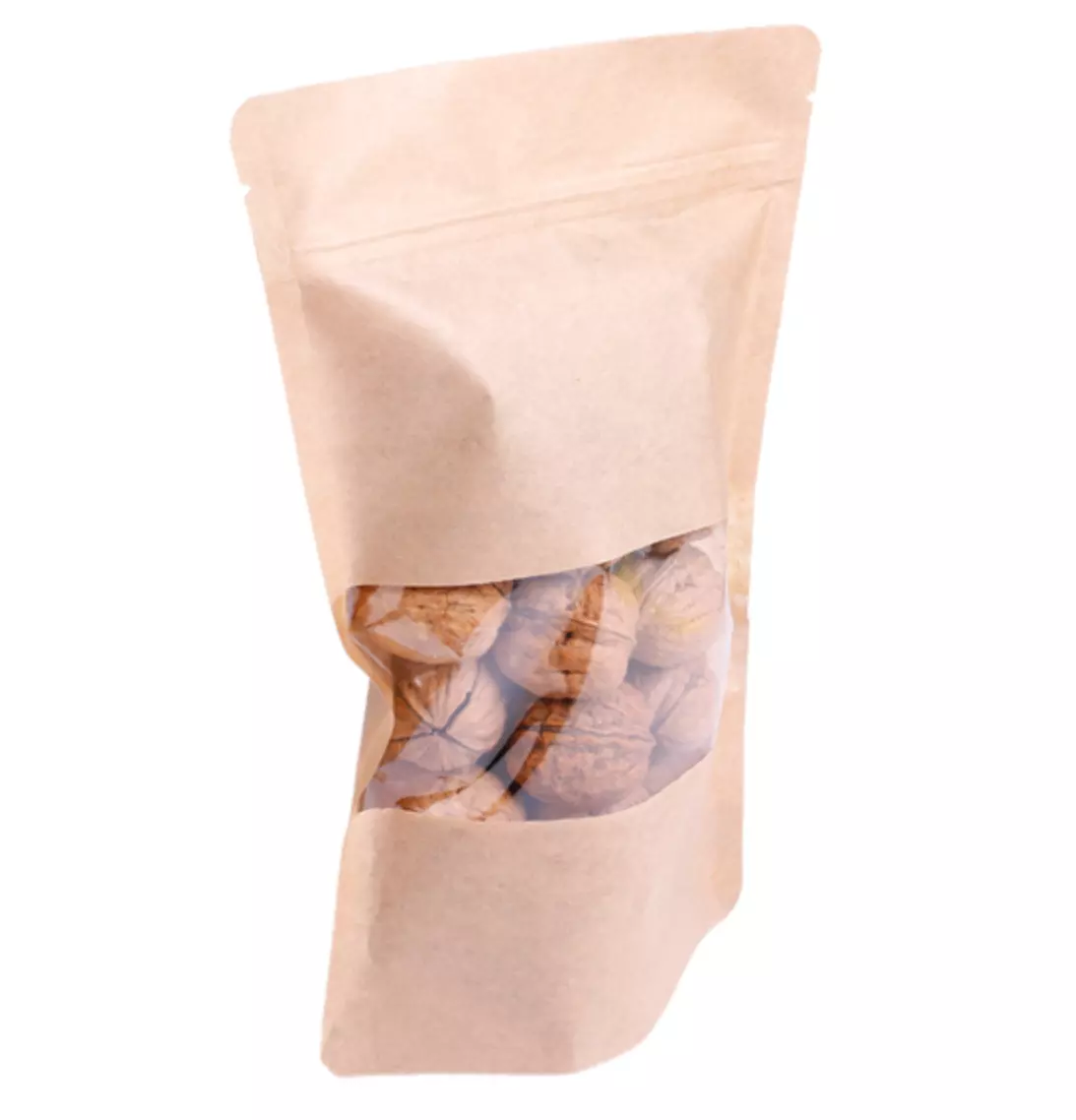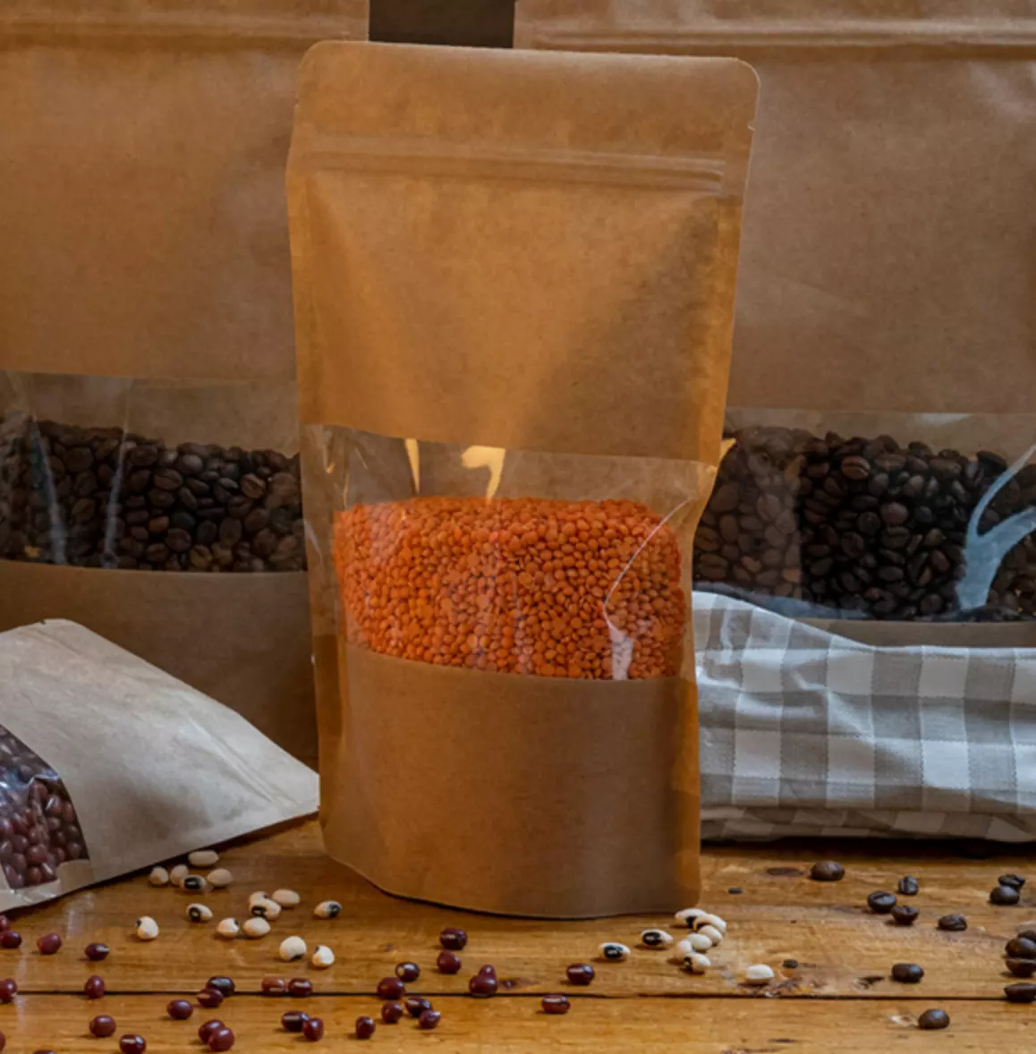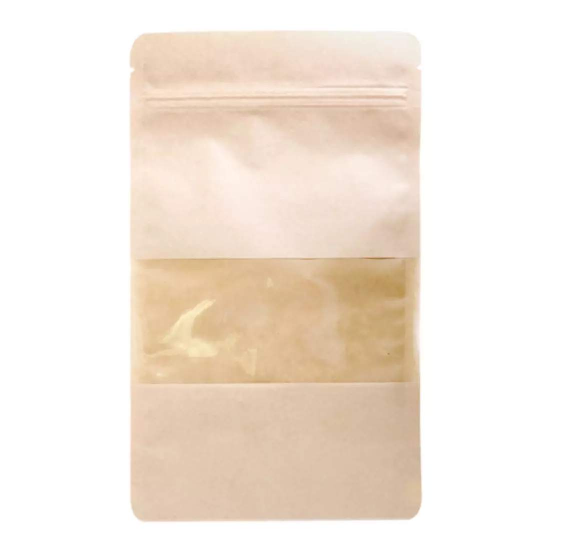Étui de 500 sacs auto‑fermeture en kraft naturel, dimensions 16+4 × 27 cm, matériau multicouche 45 g + 13 g PET + 27 g CPP (≈ 250 g/m²).