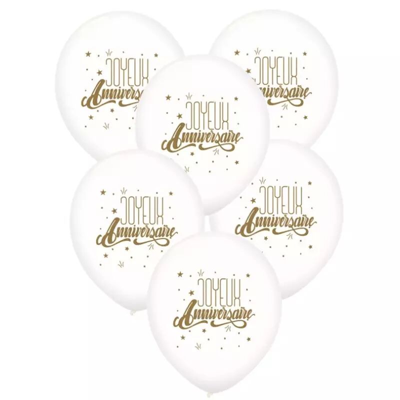 Lot de 6 ballons en latex imprimé “Joyeux Anniversaire” en blanc ou noir, diamètre 30 cm.