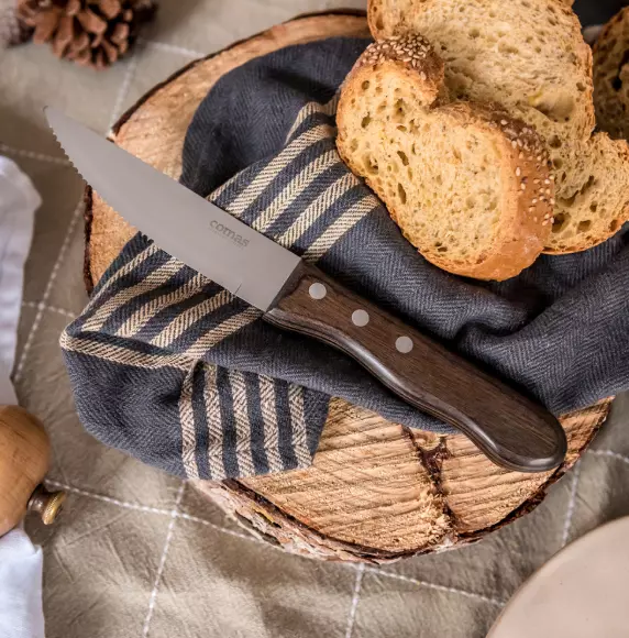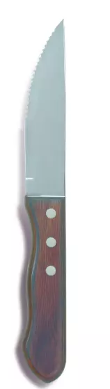 Lot de 6 couteaux à steak « Churrasco », longueur totale 254 mm, lame en acier inox 420 finition miroir, manche en bois Pakka. Chaque couteau pèse environ 96 g.