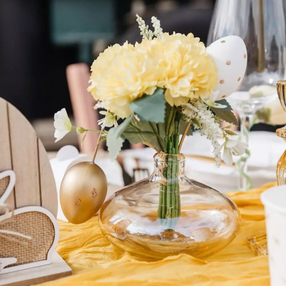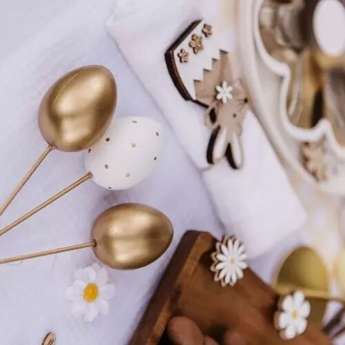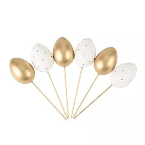 Montés sur des pics décoratifs, ces œufs peuvent être facilement plantés dans une composition florale, un bouquet, un centre de table ou un panier décoratif. Leur design raffiné aux tons blanc et or apporte une note élégante et lumineuse à votre décoration de Pâques. :contentReference[oaicite:0]{index=0}